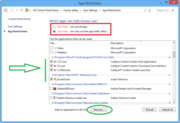 সকল সফটওয়্যার মুক্ত রাখতে উপরের ও নির্ধারিত কিছু সফটওয়্যার উন্মুক্ত রাখতে নিচের রেডিও বাটনে ক্লিক করুন। এবার নির্ধারিত সফটওয়্যার এর ক্ষেত্রে নিচের বিশাল সফটওয়্যার লিস্ট থেকে যেসকল সফটওয়্যার ব্যবহারের অনুমতি দিতে চান তাতে টিক মার্ক দিন। অন্য কোন সফটওয়্যার এ টিক মার্ক না দিলেও বিভিন্ন ড্রাইভার ও এন্টিভাইরাস এ অবশ্যই টিক মার্ক দিয়ে allow করে রাখবেন। যদি লিস্টে না থাকে তবে নিচের Browse বাটনে ক্লিক করে Hard disk থেকে সফটওয়্যার/প্রোগ্রাম টি ব্রাউজ করে দিন।