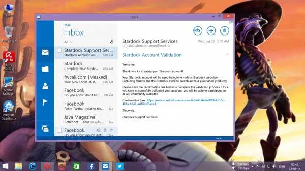 আর যারা তা পারবেন না তারা স্টার্ট মেনু হিসেবে কি ব্যাবহার করবেন তা তো বলার দরকার নেই। তবে মেট্রো অ্যাপস উইন্ডোর মধ্যে চালাতে ব্যাবহার করুন ModernMix ও নিজের উইন্ডোজ ৮/৮.১ কে পরিনত করুন পুরো উইন্ডোজ ৯ এ 😆 এটার মাধ্যমে উইন্ডোজ ৮ ব্যাবহারকারীরাও উইন্ডোজ ৮.১(আপডেট ১) এর মত টাস্কবারে মেট্রো অ্যাপগুলো পিন করতে পারবে ও ছোট ডিসপ্লের কারনে যারা ২ টার অধিক মেট্রো অ্যাপস একসাথে চালাতে পারছেন না তারাও এই সীমাবদ্ধতা কাটিয়ে উঠতে পারবেন। ছবিতে Mail অ্যাপসটি উইন্ডোর ভিতরে চলতে দেখা যাচ্ছে।