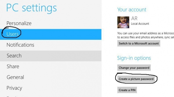 প্রথমে মাউস আপনার পিসির মনিটর এর একদম ডানে এবং একদম নিছে নিলে দেখবেন অনেক গুলো অপশন আসবে এর মধ্যে একটি হল Settings। এখন আপনার কাজ হল এই settings এ ক্লিক করা। এখানে ক্লিক করলে যে উইন্ডো ওপেন হবে তার একদম নিছে দেখুন লেখা আছে Change PC Settings। এখানে ক্লিক মারুন। এরপর বাম দিকে Users এ ক্লিক করে Change picture password এ ক্লিক করুন।