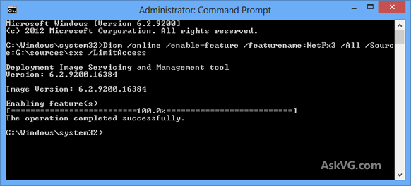 Dism /online /enable-feature /featurename:NetFx3 /All /Source:F:\sources\sxs /LimitAccess