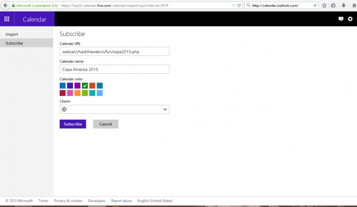 ৫) এক্তা ফর্ম দেখাবে।। অইখানে Calendar URL ঘরে এই লিঙ্ক টা দিন "webcal://hacktheweb.in/fun/copa2015.php"।।এরপর Calendar name ঘরে লিখুন "Copa America 2015"।। Calendar color এ যে কোন রং select করুন।। সব শেষে Charm এর নিচে None এ ক্লিক করে Football icon টা select করেন।।