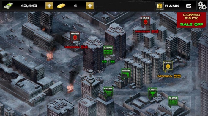 এখানে বিভিন্ন মিশন আছে, এগুলো খেললে টাকা ও গোল্ড বার পাবেন। এসব টাকা দিয়ে বিভিন্ন বন্দুক, বোমা, লাইফ, গুলি ইত্যাদি কিনতে পারবেন।