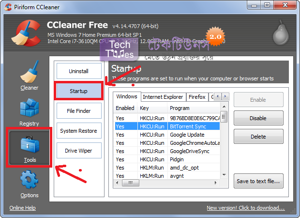 এবার দেখাবো কিভাবে উইন্ডোজ ৭ এ পিসিতে ইনষ্টল করা অ্যাপস গুলো Disable এবং Enable করবেন। উইন্ডোজ ৭ উইন্ডোজের পুরাতন ভারসন তাই এতে Startup অপশনটা নাই তা আমাদের অন্য একটি সফট্ওয়ার ব্যবহার করতে হবে। এটি হল CCleaner এখান থেকে ডাউনলোড করে ইনষ্টল করে নেন।