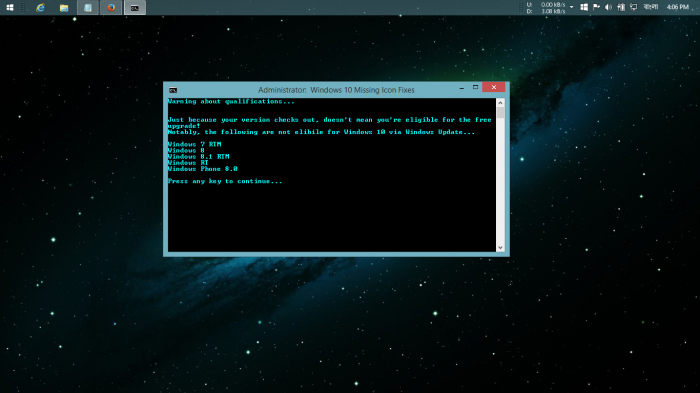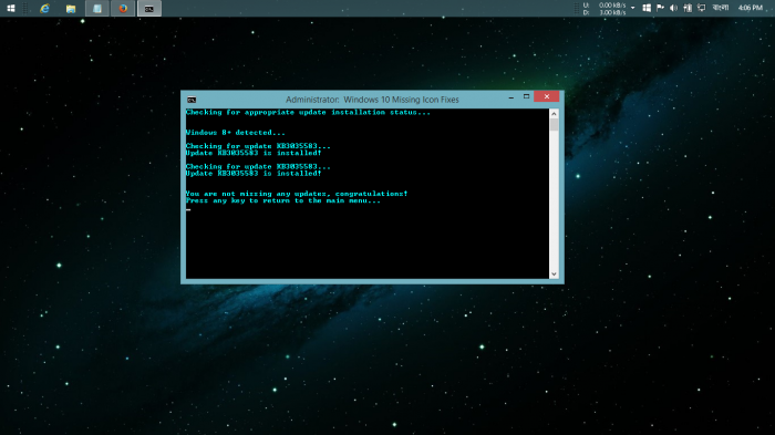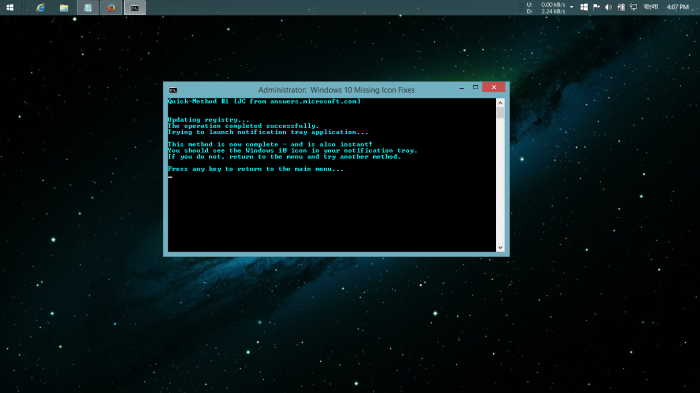 এইবার আসেন , আপনি যদি সেই কাঙ্খিত নোটিফিকেশন আইকন টি পেতে চান তাহলে অবশ্যই পুরো আপডেট না থাকলেও অন্তত KB3035583 আপডেট টি থাকতেই হবে , যাই হোক , ১ প্রেস করে ইন্টার প্রেস করুন , কেননা আগে KB3035583 আপডেট আপনার কম্পিউটারে আছে কি না আগে চেক করে নিবে , এখানে কথা হচ্ছে যে ম্যাক্সিমাম কম্পিউটারেই সেটা থাকে , যদি না থাকে সেক্ষেত্রে ম্যানুয়াল ই KB3035583 আপডেট করে নিন ।