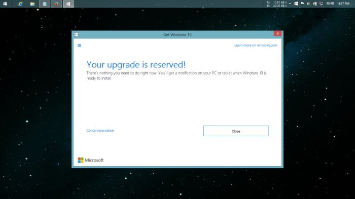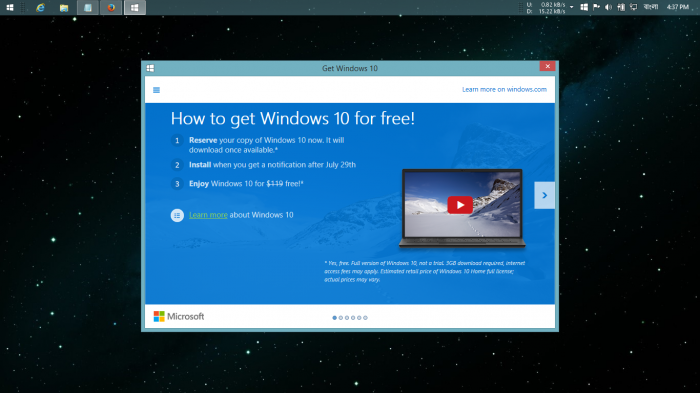 কেমন আছেন সবাই ? রোজা রমজানের দিনে বেসি কথা কমু না। খালি ইশারায় কাজ হবে 😀 , উইন্ডোজ ১০ নিয়া নতুন করে বলার কিছু নাই , নতুন এই ওএস কিছু নতুন নতুন ফিচার নিয়ে আসতেছে যা আপনার চোখ কে কপালে তুলতে বাধ্য । এটাও বলা হইতেছে যে সর্বকালের সেরা অপারেটিং সিস্টেম । কতটুকু কি জানি না তবে ব্যাবহার করলে বোঝা যাবে , আমি নিজেও এইটার ফাইনাল রিলেজ এর অপেক্ষায় আছি । মানে ২৯ এ জুলাই । হাতে সময় খুব কম । কিন্তু সব চেয়ে মজার এবং একই সাথে পাংখা বেপার জেইটা সেইটা হইলো যে ১৯৯ ডলার মুল্যের এই সিস্টেম মাইক্রোসফট ১ বছরের জন্যে আমাদের ফ্রি আপগ্রেড করার সুজগ দিবে । এবং ২৯ জুলাই এর আগে এটা টোটালি ফ্রি তে বুকিং বা রিসার্ভ করা যাবে । কেউ কেউ বলতেছেন এটার জন্য আবার উইন্ডোজ আইকন এর মত নোটিফিকেশন আইকন আসা লাগবে আপনার টাস্ক বারে , ২ জিবি এর উইন্ডোজ আপডেট দেওয়া লাগবে , এইডা করতে হবে সেইটা করতে হবে, ক্ষ্যাতা পুরি মিয়া , আসেন আমার সাথে কিছুই করা লাগবে , অক্ষন রিসার্ভ দিমু আসেন 😀 , প্রথমে এই ফাইল টা ডাউনলোড করে নিন এইখানে ক্লিক দেন