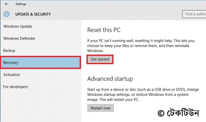 রিসেট করার জন্য প্রথমে খুলুন Setting সেখান থেকে Update & Security এবং Update & Security অপসন এর ভিতরে পাবেন Recovery সিলেক্ট করলে ডানদিকে পাবেন Reset অপসন। Reset অপসন সিলেক্ট করুন আর Reset করুন আপনার সাধের উইন্ডোস ১০।