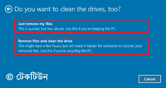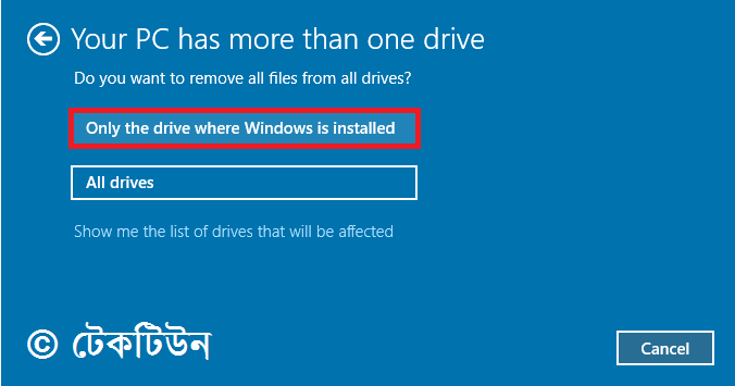 যেকোনো একটি অপসন সিলেক্ট করুন, অল ড্রাইভ সিলেক্ট করলে আপনার পুরা পিসি ফরমেট হয়ে যাবে।