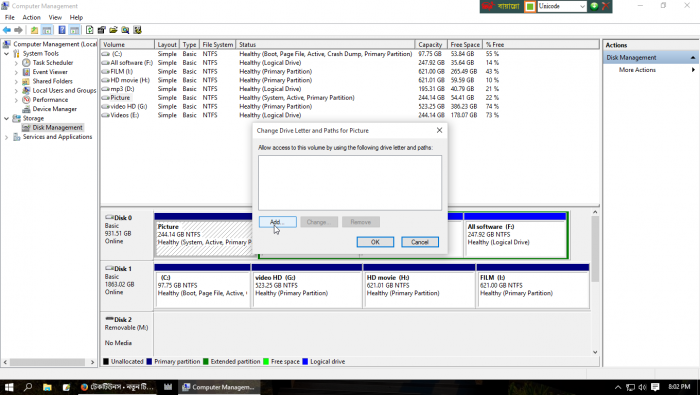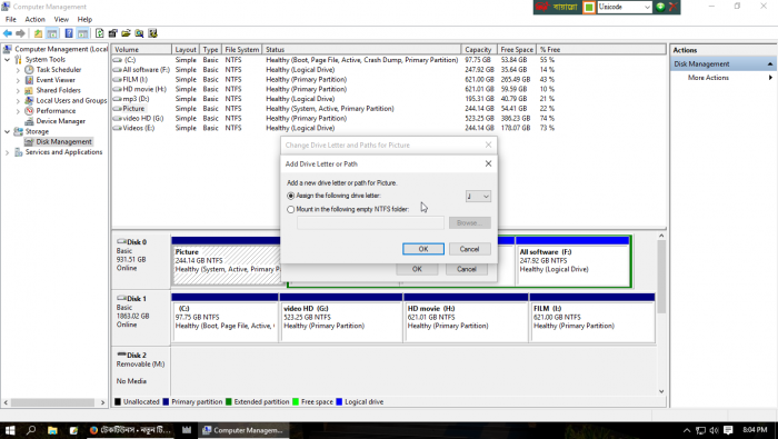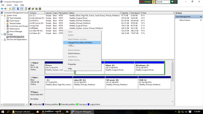 তারপর আপনার Hard Disk এর সব গুলো ড্রাইব লক্ষ্য করুন। দেখবেন যে ড্রাইবটি শো করতেছে না ভালো করে দেখুন সেই ড্রাইভে কোন Paths(ড্রাইবে কোন নাম নেই যেমন= C Drive, E Drive) নাই। তখন সেই ড্রাইবের উপর মাওস রেখে রাইট মাওস এ ক্লিক করুন। নিচের Screen shoot দেখুন