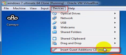 02. এবার আপনার ভার্চুয়াল-মেশিনে চলে যান, সেখান থেকে (কোন একটি মেশিন চুলু অবস্থায়) Devices > Insert Guest additions CD image নির্বাচন করুন।