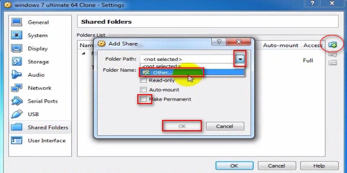 04. এবার Devices > shered folders > shered folders settings নির্বাচন করুন। উক্ত উইন্ড থেকে “+” প্লাস সাইনে ক্লিক করে Folder path: থেকে other নির্বাচন করলে একটি উইন্ড আসবে। সেখান থেকে আপনার ফোল্ডার টি দেখিয়ে দিন।