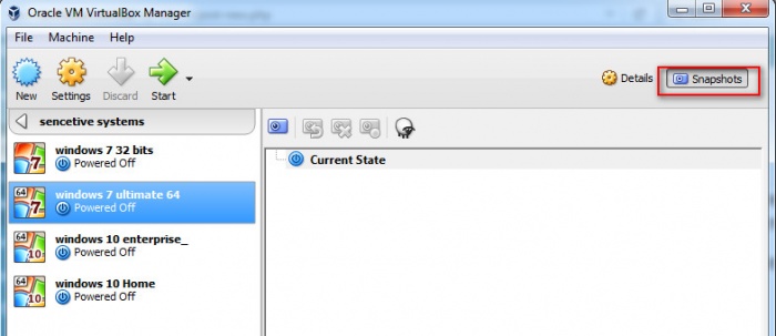 মেশিন চালু করা না থাকলে উইন্ডর ডানদিকের উপরের দিকে snapshots এর বাটন রয়েছে। তাতে ক্লিক করে একটি নাম দিয়ে ওকে করুন।