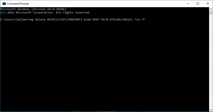 এর পর এই কমান্ড পেষ্ট করে এন্টার চাপুন reg delete HKCR\CLSID\{988248f3-a1ad-49bf-9170-676cbbc36ba3} /va /f নিচের চিত্রের মত করে