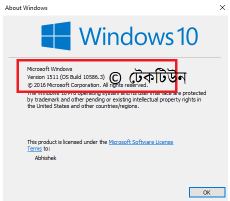 উইন্ডোজ ১০ এর অটোমেটিক আপডেট এর মাধ্যমে সকল উইন্ডোজ ১০ ইউজার এর পিসিতে যা ইন্সটল হয়ে গিয়াছে, কিন্তু যাদের অটোমেটিক আপডেট বন্ধ তাদের তো ইন্সটল হবেনা, তাই তাদের জন্য আর যারা নতুন উইন্ডোস ১০ ইন্সটল করবেন তাদের কে বলে রাখি, উইন্ডোস এর সর্বশেষ ভার্সন ১৫১১ (OS BUILD ১০৫৮৬.৩) কোড ১৫১১ মানে হলো ২০১৫ এর ১১ তম মাস নভেম্বের, এবার থেকে সব এই ভাবেই হবে বিলড নাম্বার।
