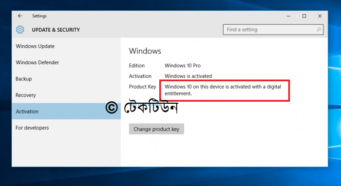 আর লেখা আসবে এইরকম, প্রোডাক্ট কি লেখাটা তে দেখতে পাবেন " windows 10 on this device is activated with a digital entitlement . "