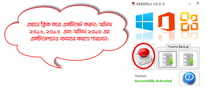 ইনস্টলেশনের সময়েই একটিভেট হয়ে যাওয়ার কথা। যদি না হয় তাহলে স্টার্ট মেনু থেকে KMS Auto / KMS Pico অ্যাপ্লিকেশনটি রান করুন। এবং নিচের চিত্রের মতো লাল বাটনটি প্রেস করুন। ৫ সেকেন্ড অপেক্ষা করলেই দেখবেন কাজ হয়ে গেছে।