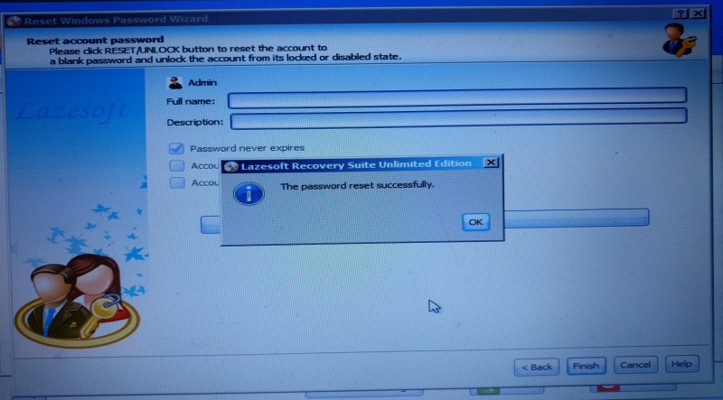 ৬. এখন ‘RESET/UNLOCK’ ক্লিক করুন। সফল হলে এখানে “The password reset successfully” মেসেজ দিবে। OK ক্লিক করুন। তারপর Finish ক্লিক করে কম্পিউটার রিস্টার্ট বা বন্ধ করে চালু করুন। দেখবেন কম্পিউটার চালু হতে কোন পাসওয়ার্ড (password) লাগবে না।