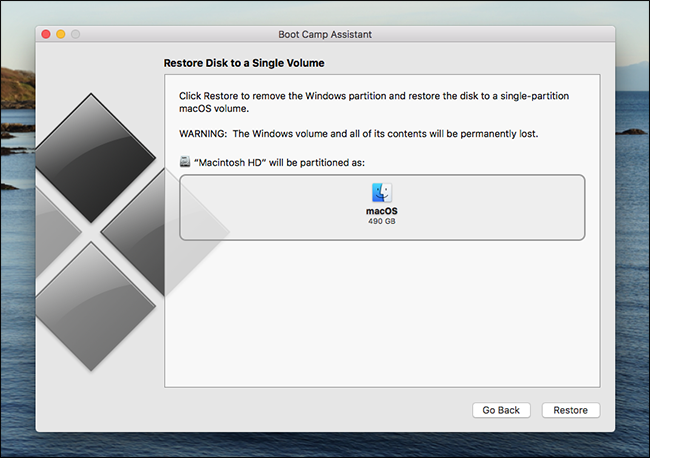 যদি আপনি আপনার ম্যাক থেকে উইন্ডোজ রিমোভ করতে চান এবং ঐ ব্যবহৃত জায়গাটুকু খালি করতে চান তাহলে macOs এ গিয়ে রিবুট দিন এবং Boot Camp assistant আবার ওপেন করুন। হায়রে এসিস্টেন্ট আর পিছু ছাড়লো না। তবে খুবই উপকারী আর কাজের জিনিস এইটা।তাই যাদের এসিস্টেন্ট আছে তাদেরকে বলবো। কখনো এসিস্ট্যান্ট এর সাথে খারাপ ব্যবহার করবেন না। তাহলে আপনার কাজে আপনি এগিয়ে যেতে পারবেন না। আচ্ছা চলুন এই assistant অন করার পর কি করবেন দেখে নেয়া যাক। এটা অন করলেই আপনি নিচের ছবির মত Restore Disk to a single volume অপশন পাবেন।