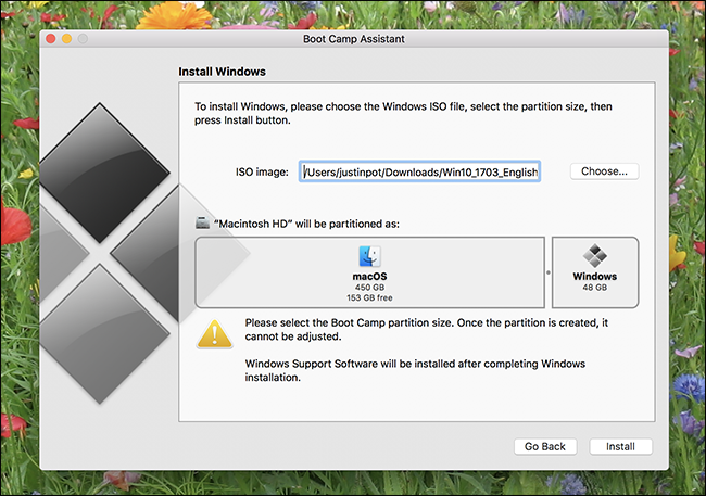 এখন আপনাকে পার্টিশন করতে হবে, ড্রাইভার ডাউনলোড করতে হবে এবং ইনস্টলার স্টার্ট হবে। আপনি continue এ ক্লিক করুন। তারা আপনাকে Iso ফাইল দেখাতে বলবে। এবং আপনার উইন্ডোজের জন্য কত বড় পার্টিশন নিতে চান সেটা সিলেক্ট করুন। নিচের স্ক্রিনশট এর মত।