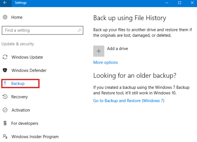 উইন্ডোজ ১০ এ উইন্ডোজ ৭ এর একটু গুরুত্বপূর্ণ ফিচার এখনো আছে। সেটি হলো উইন্ডোজ ৭ এর ব্যাকআপ করার ফিচারটি। যারা আগেই এই ফিচারটি ব্যবহার করেছেন তারা সেভাবেই এখন তা করতে পারবেন। এই ব্যাকআপ এন্ড রিস্টোর অপশন থেকে আপনি আপনার উইন্ডোজ ১০ কে ব্যাকআপ রাখতে পারবেন। এর জন্য আপনাকে উইন্ডোজ কন্ট্রোল প্যানেল থেকে সার্চ দিতে হবে “Backup and Restore” তাহলেই পেয়ে যাবেন।