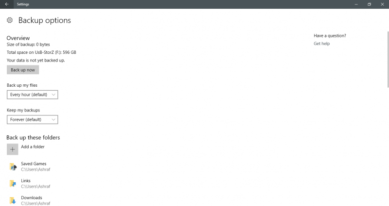 এই ফিচারটি সর্বপ্রথম উইন্ডোজ ৮ এ দেখা যায়। এই ফিচারটি উইন্ডোজের একটি অসাধারণ ব্যাকআপ করার পদ্ধতি। যদিও এই অপশনটি দিয়ে আপনি আপনার সিস্টেমের পুরো ব্যাকআপ রাখতে পারবেন না। তবে আপনি নির্দিষ্ট কিছু ফোল্ডারের নিয়মিত ব্যাকআপ রাখতে পারবেন। এজন্য আপনার একটি আলাদা হার্ড ডিস্ক ব্যবহার করতে হবে। উইন্ডোজ সার্চ বার থেকে File History খুঁজে নিয়ে ওপেন করুন তাহলে নিচের মত দেখতে পাবেন।