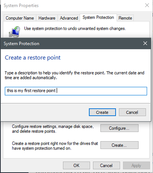 ফলে উইন্ডোজের কোন ক্ষতি হলে উইন্ডোজ আবার ঠিক হতে পারে। তবে আপনি চাইলে নিজে থেকে এরকম রিস্টোর পয়েন্ট তৈরি করতে পারেন। এজন্য আপনাকে উইন্ডোজ সার্চ বারে “Create a restore point” লিখে সার্চ দিতে হবে। তাহলেই টুলটি পেয়ে যাবেন। এর পরে সেখান থেকে “create” বাটনে ক্লিক করে আপনি সিস্টেম রিস্টোর পয়েন্ট তৈরি করতে পারেন।