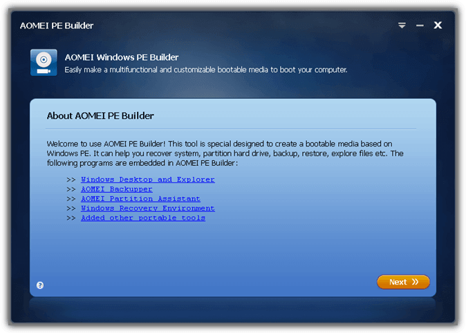 Aomei টেকনোলজি, কোম্পানিটি তাদের ব্যাকআপ সফটওয়্যার Backupper এর জন্য অধিক পরিচিত। তবে তারা Windows PE ভিত্তিক বুটেবল মিডিয়া বিনামূল্যের প্রোগ্রাম AOMEI PE Builder উন্মুক্ত করেছে। এটি Windows Recovery Environment কে ব্যবহার করে একটি Windows PE তৈরি করে।উইন্ডোজ রিকোভারি এনভাইরনমেন্ট উইন্ডোজের নতুন ভার্সন, যেমন : ৭,৮,১০ এর ভেতর থাকেই।আলাদাভাবে WAIK বা ADK ডাউনলোড করার প্রয়োজন পরে না।