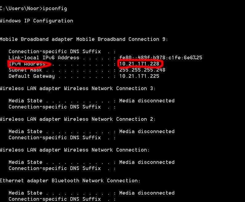 cmd অপেন হলে সেখানে লিখবেন ipconfig লিখুন। তার নিচের চিত্র চিহ্নিত স্থান হল আপনার কম্পিউটারের IP Address।
