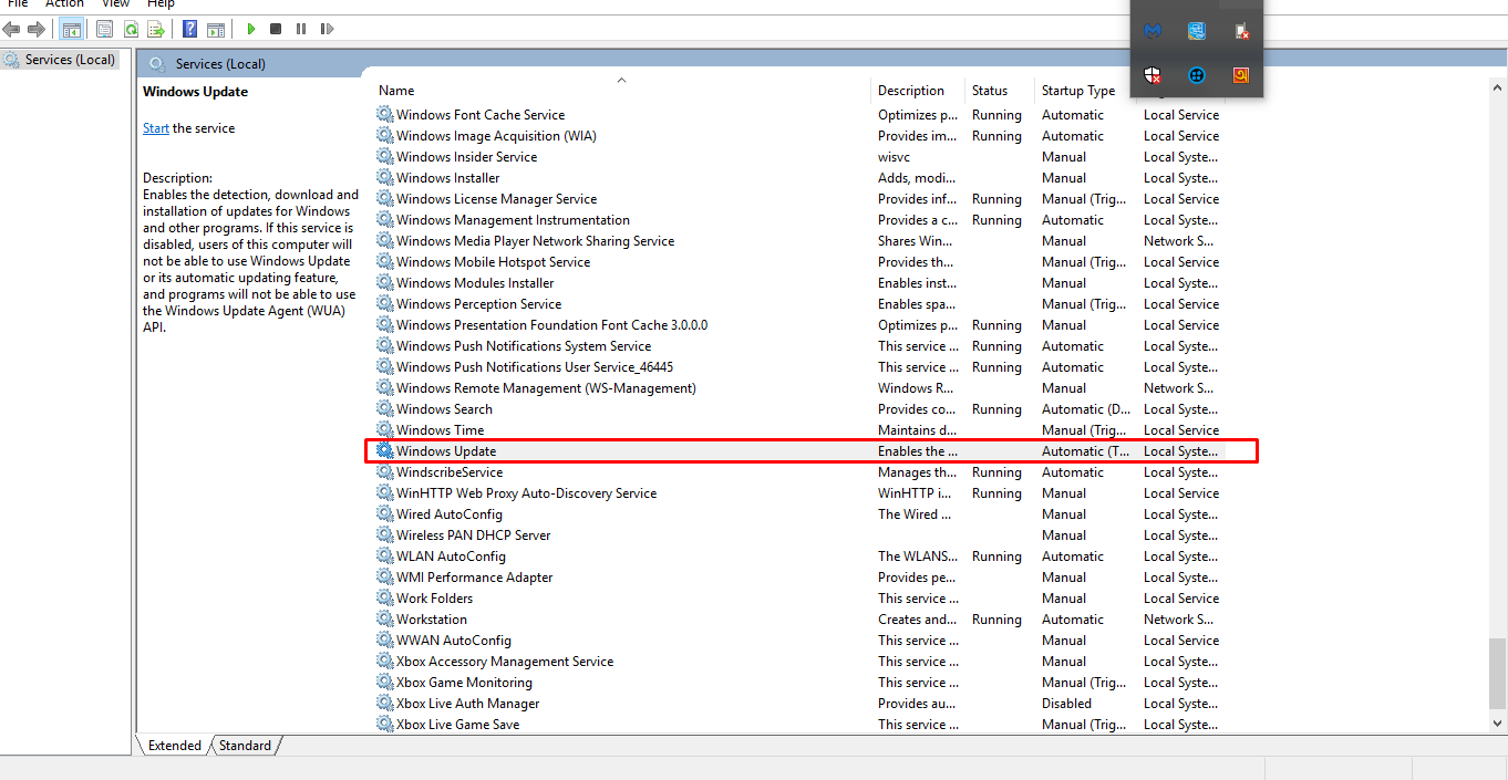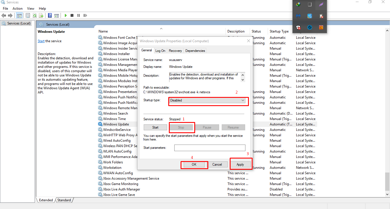 services>windows update >propertise>service status: stop and startup type : disable