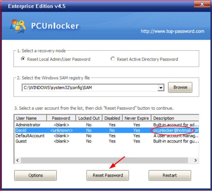 আপনি যখন সিডি বুট করেছেন, তখন আপনার হার্ড ড্রাইভে ইনস্টল করা উইন্ডোজ অপারেটিং সিস্টেমগুলি পিসি আনলকারে পাবেন। তালিকায় আপনার ব্যবহারকারী অ্যাকাউন্টগুলির মধ্যে একটি নির্বাচন করুন এবং এগিয়ে যেতে পাসওয়ার্ড পুনরায় সেট করুন বোতামে ক্লিক করুন।