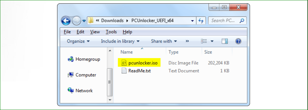 প্রথম জিনিসটি পিসি আনলকারের জন্য জিপ ফাইলটি ডাউনলোড করুন যা আপনি অ্যাক্সেস করতে পারেন। পরবর্তী, আপনার হার্ড ডিস্কের একটি ফোল্ডারে জিপ ফাইলের সামগ্রীগুলি বের করুন। উইন্ডোজ এক্সপ্লোরারে এক্সট্র্যাক্ট ফোল্ডারটি খুলুন, এবং আপনি একটি সিডি (বা ইউএসবি) এ পোড়াতে হবে এমন একটি ISO ফাইল পিসিুনlockার.আইএসও দেখতে পাবেন।