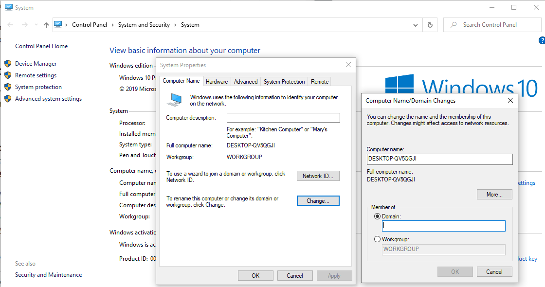 আবার চলে যান Control Panel\System and Security\System এ এবং Change Settings এ ক্লিক করুন। এবার Domain এর পরিবর্তে Workgroup সিলেক্ট করে দিন।