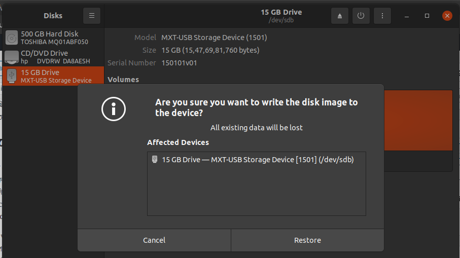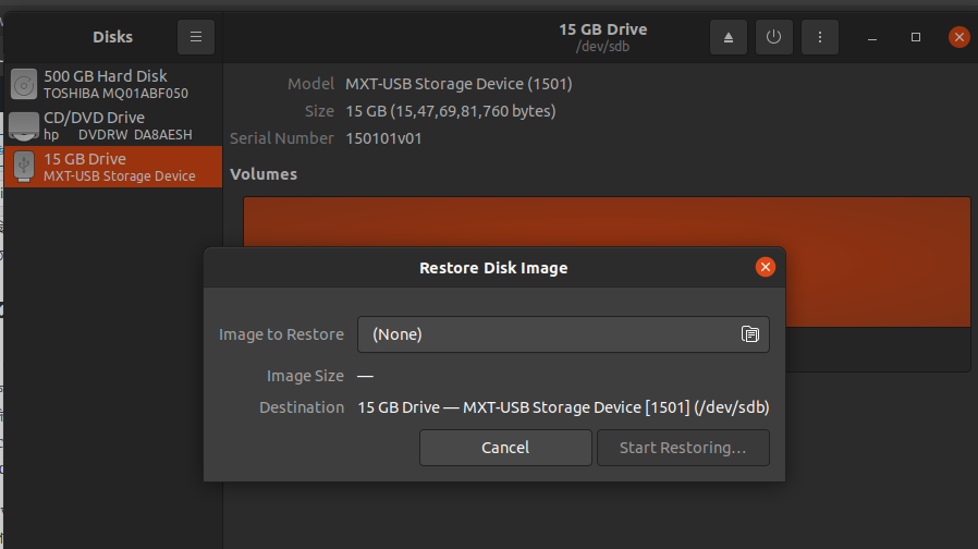 উপরে থাকা থ্রী ডট বাটনে ক্লিক করুন. তারপর আপনার সামনে কিছু অপসন আসবে। সেখান থেকে Restore Disk Image বাটনে ক্লিক করুন। তারপর আবার নিচের মতো একটি পপআপ আসবে।