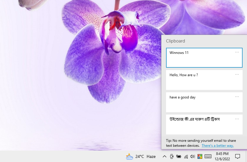 উইন্ডোজ কী এর অন্যতম কাজের একটি শর্টকাট হচ্ছে ক্লিপ-বোর্ড শর্টকাট। আমরা সবাই জানি crlt + v দিয়ে কপি করা টেক্সট পেস্ট করা যায়, তেমনি আপনি যদি Win+v প্রেস করুন তাহলে ক্লিপবোর্ডের সকল কপি করা টেক্সট দেখতে পাবেন।