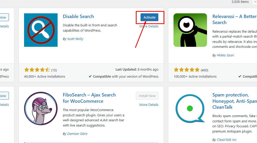২. Install Disable Search Plugin: আপনার WordPress Control Panel থেকে "Install Plugin" Page-এ যান, Search Field-এ "Disable Search" লিখে Plugin-টি খুঁজে বের করুন এবং "Install Now"-তে Click করে Website-এ Download করুন ও Activate করুন।