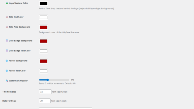 ২. কাস্টম লোগো ও ডায়নামিক ওয়াটারমার্ক: ফ্রি এই প্লাগিনটিতে আপনি আপনার নিউজ পোর্টাল বা ব্লগের নিজস্ব লোগো আপলোড করে সুন্দর একটি ওয়াটারমার্ক দিতে পারবেন। শুধু তাই নয়, কার্ডের লোগোটির ট্রান্সপারেন্সি বা অপাসিটি (Opacity) আপনি নিজের ইচ্ছেমতো কমানো-বাড়ানো করতে পারবেন, যা ডিজাইনকে আরও চমৎকার করে তুলবে।