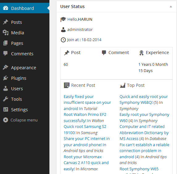 Plugins টি আপনার সাইটে Active করলে আপনার ড্যাসবোর্ডে নিন্মোক্ত সুবিধাদি পাবেন। এটি একদিনে বসে করা হয়েছে, যদি আপনাদের ভাল লাগে এবং ভাল রেটিং পাই তবে এটিতে দিনে দিনে আরো সুবিধা যোগ করা হবে (ইনশা আল্লাহ)