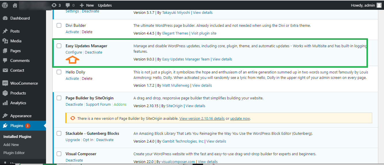 এবার আপনি Plugins > Installed Plugins যান এবং Easy Updates Manager খুঁজে বের করে Configure এ ক্লিক করুন।