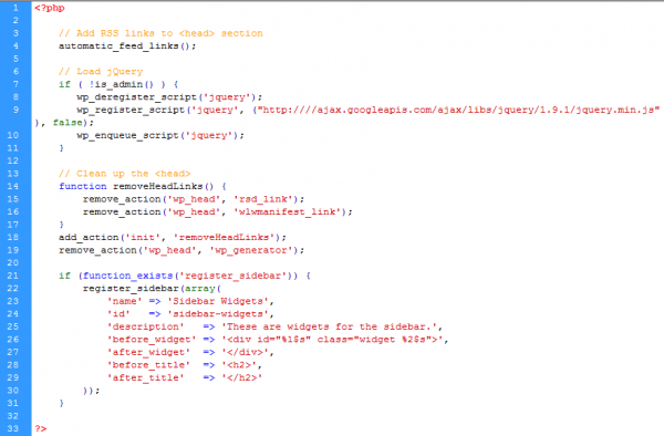 এখানে জেকোয়ারী ফাইলটি যুক্ত করা হয়েছে। এছাড়া হেডার ও সাইডবারে উইডগেট গুলো ঠিকঠাক কাজ করার জন্য কিছু কোড ব্যবহার করা হয়েছে। ওয়ার্ডপ্রেসের জন্য এই ফাইল অতি গুরুত্বপূর্ণ। আপনার থিমে কোনো অতিরিক্ত সুবিধা যুক্ত করার জন্য এই ফাইলটিতে কাজ করতে হয়। প্রিমিয়াম থিমগুলোতে দেখি অনেক সুযোগ সুবিধা থাকে, আবার থিমের বিভিন্ন অপশন যুক্ত করা হয়। যার বেশির ভাগ কাজ এই ফাইলটিতে করা হয়ে থাকে। থিমের অপশন যুক্ত করার জন্য একটি জটিল সুন্দর প্লাগিনস হলো Options Framework.