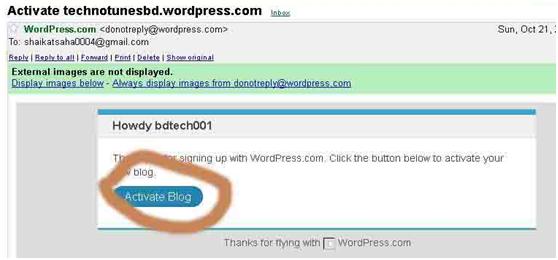 ০৬. আপনি sign up এর সময় যে ই-মেইল একাউন্ট ব্যবহার করেছিলেন সেই মেইল আইডিতে প্রবেশ করুন। মেইলটি ওপেন করে Active Blog এ ক্লিক করুন।