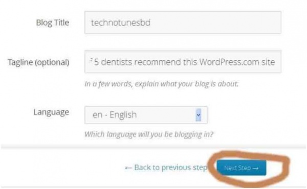 ০৮. এখন আপনাকে Blog Title এর ঘরে আপনার ব্লগ সাইটের টাইটেল দিতে হবে। এটি অবশ্য অটোমেটিক হয়ে যাবে। আপনি যদি এই নামটি চেন্জ করতে চান তাহলে আপনি এই ঘরে মাউস পয়েন্টার রেখে তা পরিবর্তন করতে পারবেন। Tagline(optional) এই ঘরে আপনি আপনার ব্লগ সাইটের জন্য সংক্ষেপে কিছু বর্ননা লিখুন। তারপর Next Step এ ক্লিক করুন।
