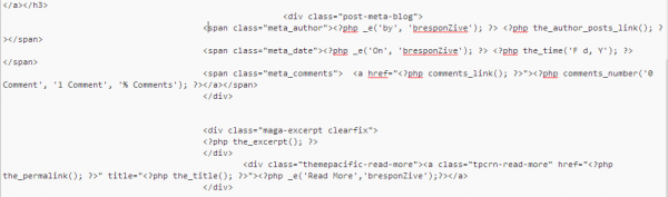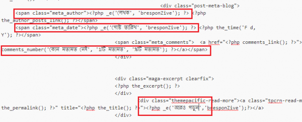 তো আমার বাংলা করতে হলে প্রথমেই আমার এডমিন প্যানেলে যেতে হবে । তার পর এডমাইন সাইড মেনু থেকে Appearance এর অধিনে থাকা Editor এ ক্লিক করে থীম Edit অপশনে যাব । তারপর থীম অপশন এর বাম পাশ থেকে loop.php [ আমার থীমে ] [ আপনাদের থীমে থাকতে পারে content.php, loop-content.php, blog-loop.php, post-loop.php, post.php, content-loop.php, blog.php, post.php ইত্যদি নামে বা অন্য নামে । যদি এই নাম গুলির সাথে না মিলে তাহলে content.php, post.php এরকম কোন নাম পেলে সেটা ওপেন করূন তারপর আপনি ঠিক ফাইলটি ওপেন করেছেন কিনা তা চেক কারার জন্যে আপনার মূল ব্লগ পেজে চলে জান এবং সেখানে দেখুন যে, আপনার পোষ্ট সমুহে টাইটেল এর নিচে ইংরেজিতে কি কি লিখা আছে যেমন আমর পোষ্ট টাইটেল টির নিচে িইংরেজিতে by, on এবং Comment লিখা আছে । যা প্র্রত্যেক পোষ্টের টাইটেল এর নিচে অবস্তান করে । এখন এগুলি মনে রেখে যেমন আমি মনে রাখলাম যে আমার ইংরেজিতে Comment লিখাছিল ।[ Comment ছাড়াও Replies বা অন্য কিছুও থাকতে পারে । ] তারপর আপনার Editor অর্থাৎ থীম Editor এ loop.php ফাইলটি সিলেক্ট করে