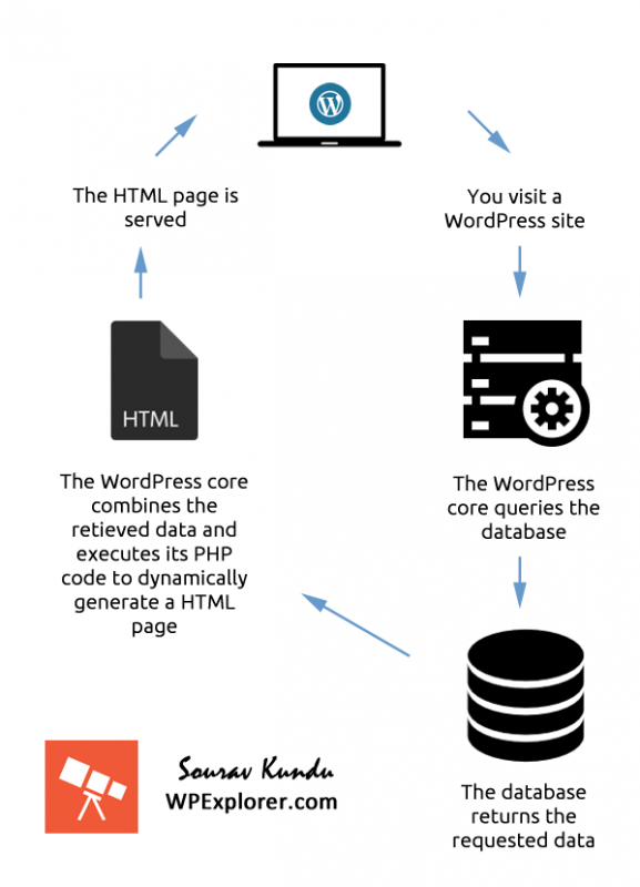 ওয়ার্ডপ্রেস পিএইচপি ও মাই এসকিউএল দিয়ে তৈরি। অর্থাৎ এটি ডাটাবেজ নিয়ে কাজ করে। ওয়ার্ডপ্রেস ওয়েবসাইট এ মুলত কয়েকটি টেমপ্লেট থাকে, এবং প্রয়োজনীয় কন্টেন্ট গুলো ডাটাবেজ থেকে কল করে টেমপ্লেট এর সাহায্যে দেখায়। তাই ওয়ার্ডপ্রেস এ নতুন একটি পেজ তৈরি করতে হলে নতুন করে কোডিং বা বেশি কিছু লিখতে হয় না। পেজ এর কন্টেন্ট লিখে পেজ তৈরি করলেই নির্ধারিত টেমপ্লেট এর একটি পেজ তৈরি হয়ে যায়। এবং পরবর্তীতে কোন পেজ বা পোস্ট এর কোন কন্টেন্ট পরিবর্তন করতে চাইলে কোড এ কোন পরিবর্তন না করে সহজে কন্টেন্ট টি এডিট করা যায়।
