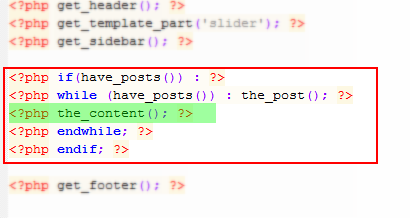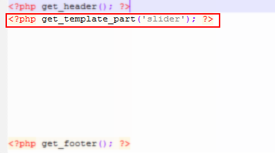 বর্তমান সময়ে প্রায় সকল থিমেই ইমেজ স্লাইডার থাকে। তাই আমরা ইমেজ স্লাইডারের জন্য প্রয়োজনীয় কোড সমূহ copy করে slider.php তৈরি করতে পারি। slider.php ফাইল index.php তে যুক্ত করার জন্য যুক্ত করতে হবে <?php get_template_part('slider');?>