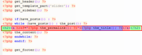 সাধারণত post হেডিং h2 ট্যাগের মধ্যে রাখতে হয়। এজন্য সবুজ জলছাপ দেয়া অংশটি h2 ট্যাগ নির্দেশ করছে। লিংক যুক্ত করার জন্য লাল জলছাপ চিহ্নিত এংকর বা a ট্যাগ ব্যবহার করা হয়েছে যার হাইপার লিংক হিসেবে ডাইনামিক post পার্মালিংক যুক্ত করার জন্য <?php the_permalink();?> ব্যবহার করা হয়েছে। সব শেষে নিল জলছাপ চিহ্নিত <?php the_title();?> ব্যবহার করা হয়েছে post টাইটেল প্রদর্শন করার জন্য।