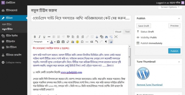 আশা করি সবাই ভাল আছেন। আসলে টিটিতে আমি একজন নিয়মিত ভিজিটর। ব্লগিং তেমন একটা করতে পারিনা বলেই টিটিতে কোন পোস্ট করি না। যাইহোক অন্যান্য দিনের মত এবারো বেশ কয়েকটি সমস্যাতে পড়েছি। সমস্যাটি মূলত ওয়ার্ডপ্রেস ব্লগিং নিয়ে। টিটিতে যারা অভিজ্ঞ টিউনার/লেখক রয়েছেন তাদের দৃষ্টি আকর্ষণ করছি। অনুগ্রহ করে আমাকে একটু রিভিউ দিন!! কেউ এড়িয়ে যাবেন না!! .......প্লিজ!!!!