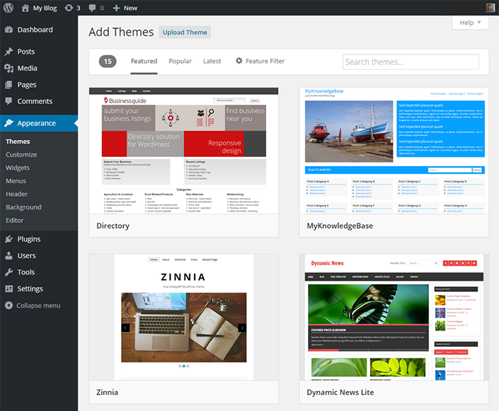 এখানে আপনি আপনার থিম সমূহ দেখতে পারবেন। অর্থাৎ, আপনার ওয়ার্ডপ্রেস এ ইন্সটল করা সকল থিম এখানে দেখতে পারবেন। ওয়ার্ডপ্রেস ইন্সটল করার পর কিছু থিম ইন্সটল করাই থাকে। এবার আমরা নতুন থিম ইন্সটল করবো। এজন্য Add New Theme বাটনে ক্লিক করুন। এবার আপনি ওয়ার্ডপ্রেস এর প্রচুর থিম পাবেন;