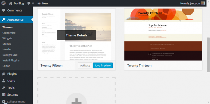 এখন আমরা দেখবো কিভাবে আমরা আমদের ওয়ার্ডপ্রেস সাইটের থিম পরিবর্তন করতে পারি। ওয়ার্ডপ্রেস এ নতুন থিম ইন্সটল করার জন্য প্রথমে Dashboard > Appearance > Themes এ যান। তাহলে নিচের চিত্রের মত দেখতে পারবেন;