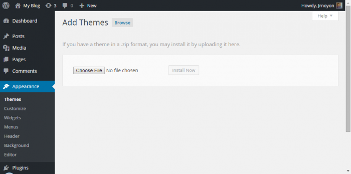 আপনি চাইলে ওয়ার্ডপ্রেস থিম ডাউনলোড করে ইন্সটল করতে পারেন। ওয়ার্ডপ্রেস থিম ডাউনলোড করতে গুগল এ সার্চ দিতে পারেন। সেখানে প্রচুর পরিমানে ফ্রি থিম পাবেন। আপনি চাইলে পেইড থিম ব্যবহার করতে পারেন। প্রিমিয়াম থিম ব্যবহার করতে হলে আপনাকে ওয়ার্ডপ্রেস থিম ক্রয় করে ব্যবহার করতে হবে। এছাড়া, আপনি চাইলে আপনি নিজেই ওয়ার্ডপ্রেস থিম ডেভেলপমেন্ট করে থিম আপলোড করতে পারেন। তবে, আপনাকে ওয়ার্ডপ্রেস থিম ডেভেলপার হতে হবে। ওয়ার্ডপ্রেস এ থিম আপলোড করে থিম ইন্সটল করার জন্য Upload Theme বাটনে ক্লিক করুন;