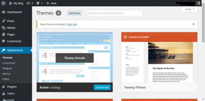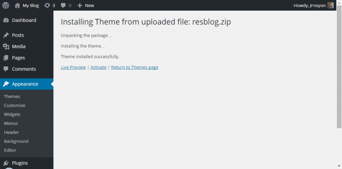 আমি একটি resblog নামে ওয়ার্ডপ্রেস থিম আপলোড করেছি। আপলোড সম্পূর্ণ হলে নিচের চিত্রের মত দেখতে পারবেন। আপনি চাইলে থিম Activate করার পূর্বে থিম এর প্রিভিউ দেখতে পারবেন। অর্থাৎ, থিমটি ইন্সটল করলে আপনার সাইটটি কেমন দেখাবে তা ওয়ার্ডপ্রেস থিম ইন্সটল করার পূর্বেই দেখে নিতে পারেন। এজন্য Live Preview এ ক্লিক করুন। এছাড়া, আপনি চাইলে ওয়ার্ডপ্রেস থিমটি শুধু ইন্সটল করে রাখতে পারেন। পরে, আপনার যখন ইচ্ছা থিম Activate করে ব্যবহার করতে পারবেন। এজন্য Return to Themes page এ ক্লিক করুন। আর যদি ওয়ার্ডপ্রেস থিম Activate করতে চান তাহলে Activate Theme এ ক্লিক করুন;