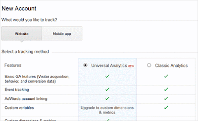 স্টেপ-৩. এরপর যে স্ক্রীন টি আপনার সামনে আসবে সেখানে ২টি অপশন দেখতে পাবেন, একটি ওয়েব সাইট এবং অন্যটি মোবাইল এপ্স। খেয়াল রাখবেন আপনি যখন ক্লিক করবেন তখন সেটা যেন ওয়েব সাইট হয়ে থাকে। এ সময় গুগোল এনালিটিক্স আপনাকে বেঁছে নিতে বলবে তার ২টি সেবা। একটি universel analytics account এবং অন্যটি classic analytics account. আপনি আপনার ইচ্ছে মত যে কোন একটি সেবা বেঁছে নিতে পারেন।